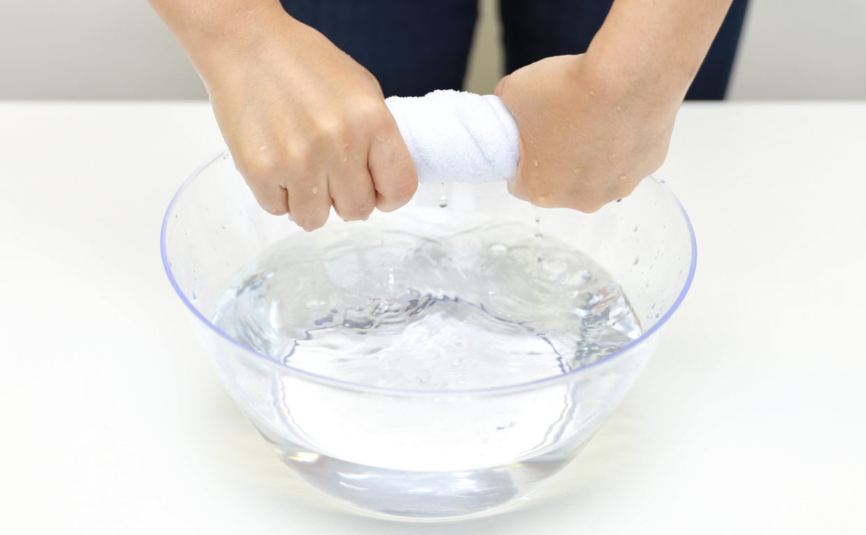 手順1:タオルをぬるま湯に浸けてから、よく絞る