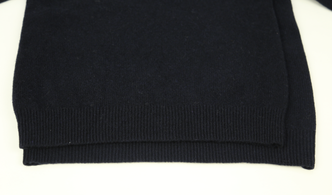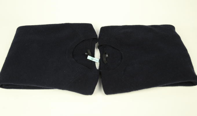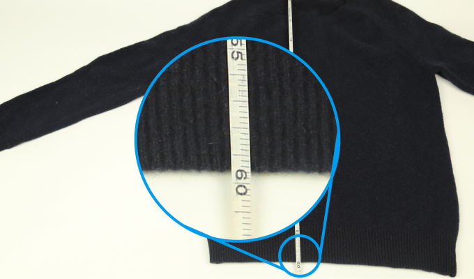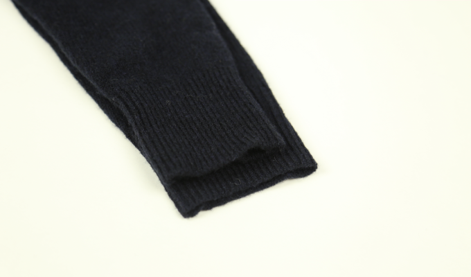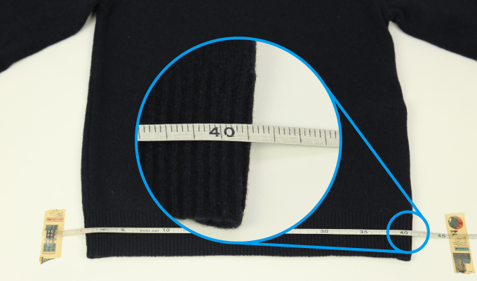 おしゃれ着用洗剤で洗ったセーター(上)とドライクリーニングで洗ったセーター(下)を重ねてみました。袖口は重ねてみるとこんなに差がでてしまいました。