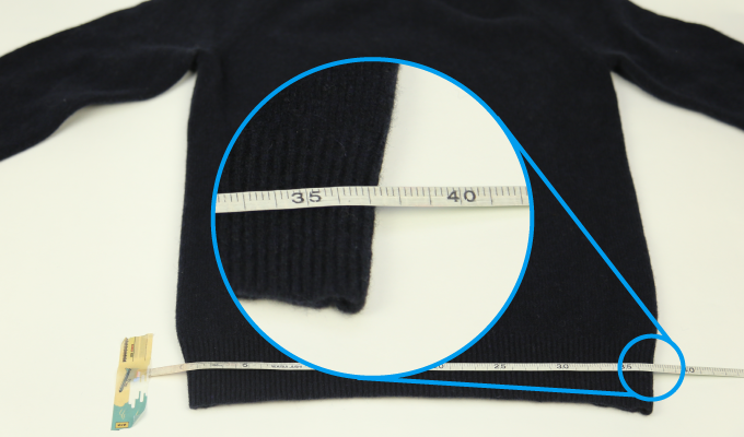 液体洗剤を使用し、洗濯機の「ドライコース」で洗った場合は、袖と丈の長さは2と同様の変化がありましたが、幅はなんと43.0cm→36.2cmに。約7cmも縮んでしまいました。