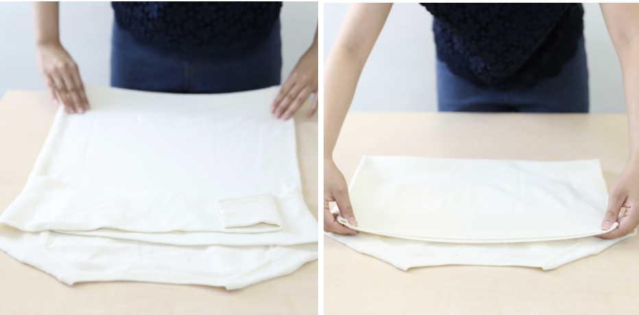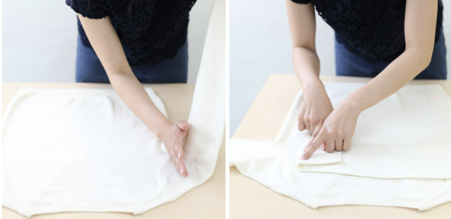 まず、袖からたたんでいきます。袖はなるべく接合部の縫い目に沿うようにたたみましょう。接合部がない場合などは肩の部分から反対側の肩の方へ袖がいくようにたたみます。