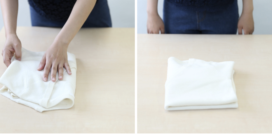保管場所がない、さらに小さくたたみたい場合は、身頃をたたんだら、次に洋服の真ん中で縦に半分にたたんでください。