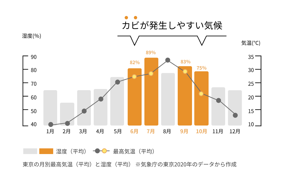 カビが発生しやすいのは、気温20〜30℃、湿度70〜80%以上。東京の気温と湿度を例に見ると、これに当てはまるのが6〜7月の梅雨時期と、9〜10月ごろ。秋は台風の季節でもあり、湿度が高いという点も梅雨時期と重なります。