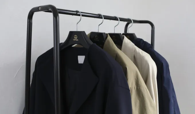 ハンガーは厚みがあり、肩幅の合うものを使います。重い生地やニット生地の場合は吊るし保管で伸びてしまったり、形崩れが出ることがあるので、何でもハンガーに吊さずにアイテムごとに保管方法を検討しましょう。